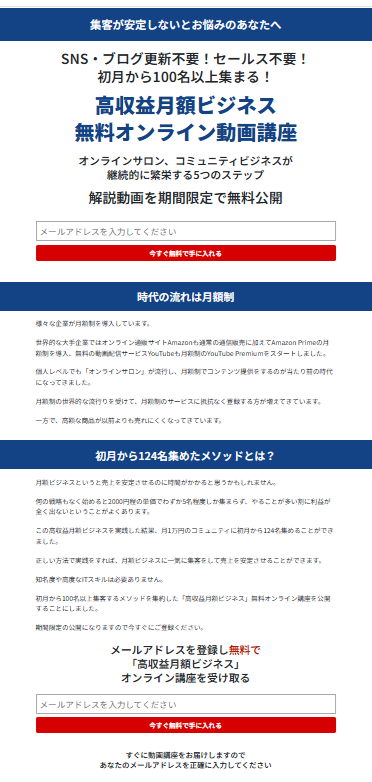 シンプルな分、メールアドレス入力ボックスが目立ちますね。ちなみに、メールアドレス入力以外にも、「LINE登録」ボタンにしたり、「電話番号入力ボックス」にしたりと、自分のビジネスに合わせてアレンジできます。