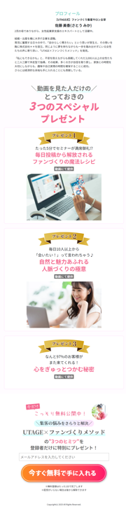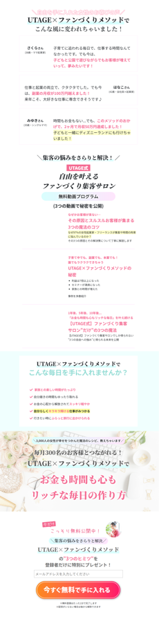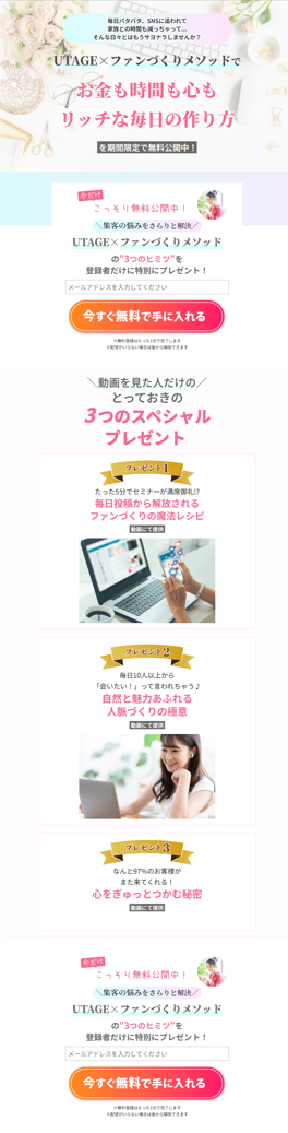 例えば、UTAGEに初めから入っているLPのテンプレートで「女性起業家向けデザイン」というものがあり、それはこんな感じ↓です。